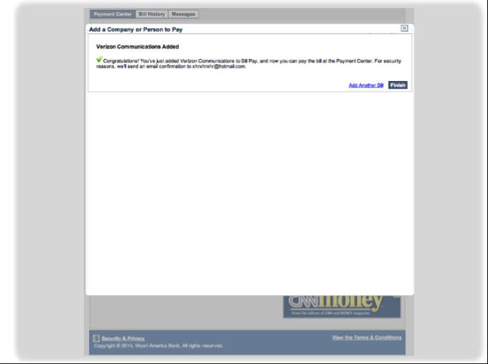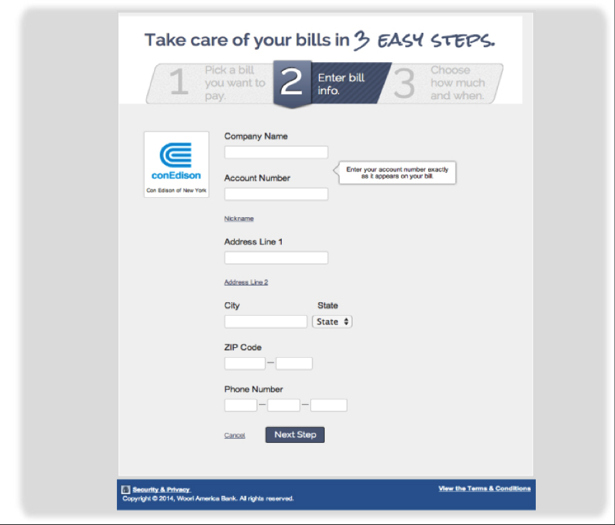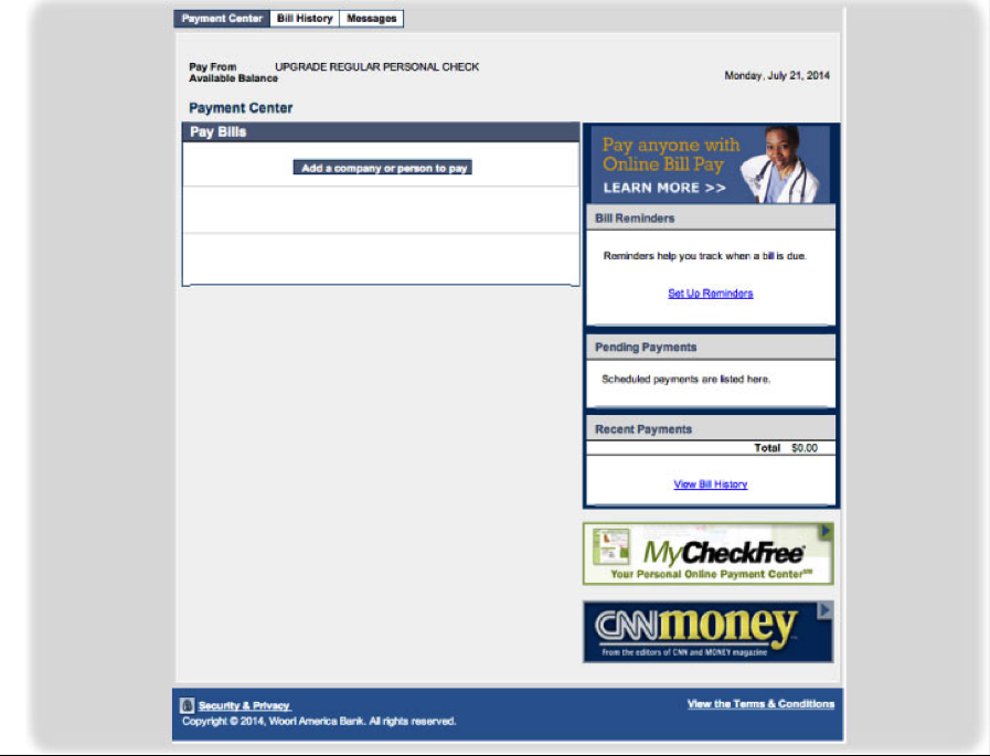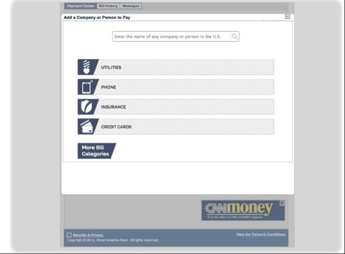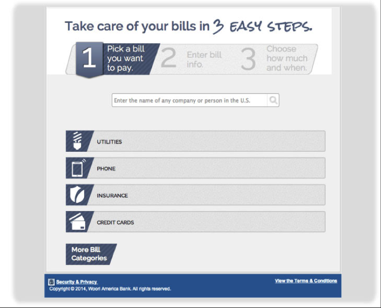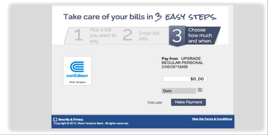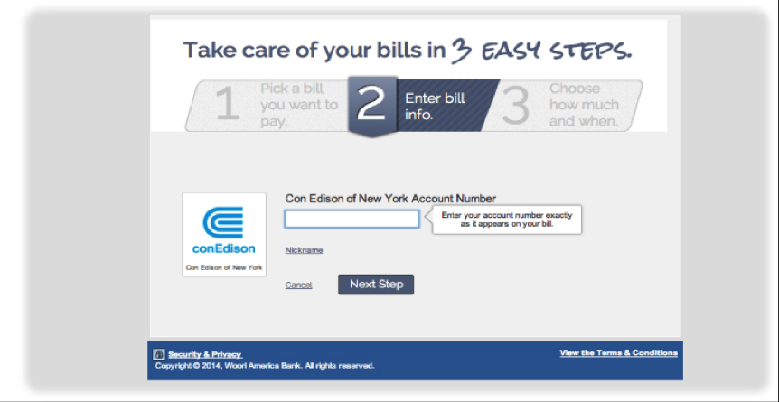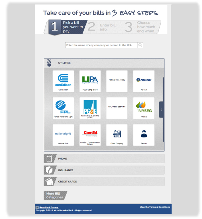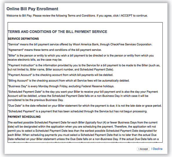 Take advantage of Woori America Bank's bill payment service! The green service, which will provide quick and convenient way of paying bills without issuing the check for utility, auto, or mortgage bills. For registration help, please refer to bill payment enrollment instruction below. For inquiries on Bill Payment Service, visit your nearest branch or call 1-888-MyWoori (699-6674).